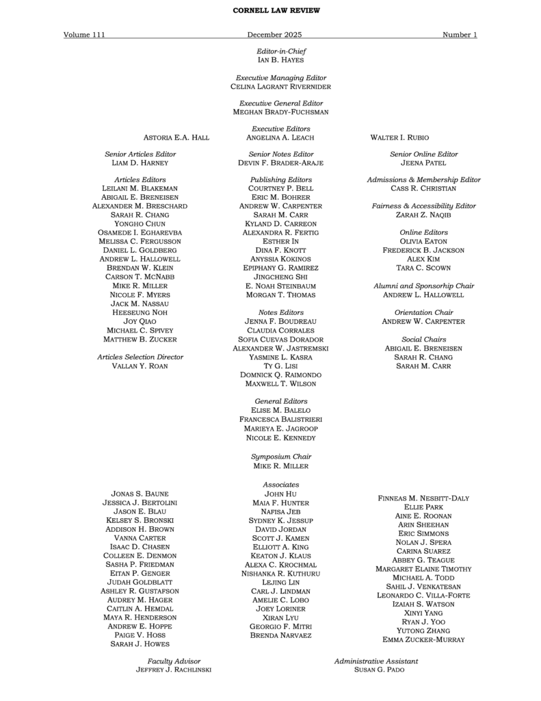 Cornell Law Review Volume 111 Masthead